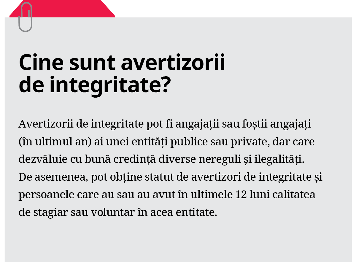 În Republica Moldova de cinci ani este în vigoare o lege a avertizorilor de integritate care încurajează angajații din sectorul public și privat să dezvăluie practici ilegale și abuzive de la locul de muncă. Chiar dacă actul legislativ este funcțional de câțiva ani, sunt puține cazuri când angajați sau foști angajați dezvăluie eventuale cazuri de corupție, încălcări ale drepturilor fundamentale ale persoanei, ale securității naționale sau alte nereguli care ar afecta interesul public. Experții în domeniul drepturilor omului și anticorupție sunt de părere că eventualii avertizori de integritate încă se tem de frica de răzbunare și nu au încredere în mecanismul existent de protecție.