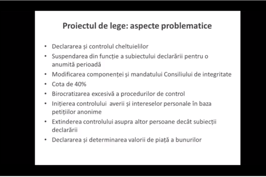 În cadrul mesei rotunde, experta anticorupție Mariana Kalughin a analizat mai multe amendamente propuse la Legea cu privire la Autoritatea Naţională de Integritate și la Legea privind declararea averii și a intereselor personale, din perspectiva efectelor pe care aceste amendamente le vor produce asupra sistemului național de integritate în general și asupra activității ANI, în particular. „Să luăm, spre exemplu, propunerea de a institui cota de 40% pentru verificarea declarațiilor și 40% pentru inițierea controalelor care să vizeze deputații, miniștrii, judecătorii, procurorii etc. Aceste categorii au fost verificate de ANI de la bun început, ei știu cum să-și declare averile și interesele. Ce rost are să obligăm ANI să se mențină într-o anumită albie și să nu se concentreze și pe alte categorii de subiecți care sunt în zona de risc? Noi avem diferite categorii de subiecți ai declarării, cum ar fi colaboratorii organelor de drept, ai organelor de control, inspectori fiscali, ofițeri de investigație, ofițeri de urmărire penală, care niciodată nu au fost în vizorul ANI, iar nivelul de corupție aici la fel este ridicat”, a subliniat experta. Totodată, M. Kalughin s-a arătat surprinsă că noile prevederi legislative nu doar mențin, dar și extind procedurile birocratice în activitatea inspectorilor de integritate: „Inspectorii de integritate vor fi obligați și în continuare să întocmească procese-verbale pentru orice activitate, chiar dacă în fond nu se constată anumite încălcări și nu există temei pentru inițierea unor controale”. Experta a analizat critic și propunerile legislative care vizează extinderea controlului asupra persoanelor terțe în raport cu subiecții declarării, obligarea acestora să-și declare și cheltuielile, declararea și determinarea valorii de piață a bunurilor, atribuțiile și componența Consiliului de Integritate (CI).