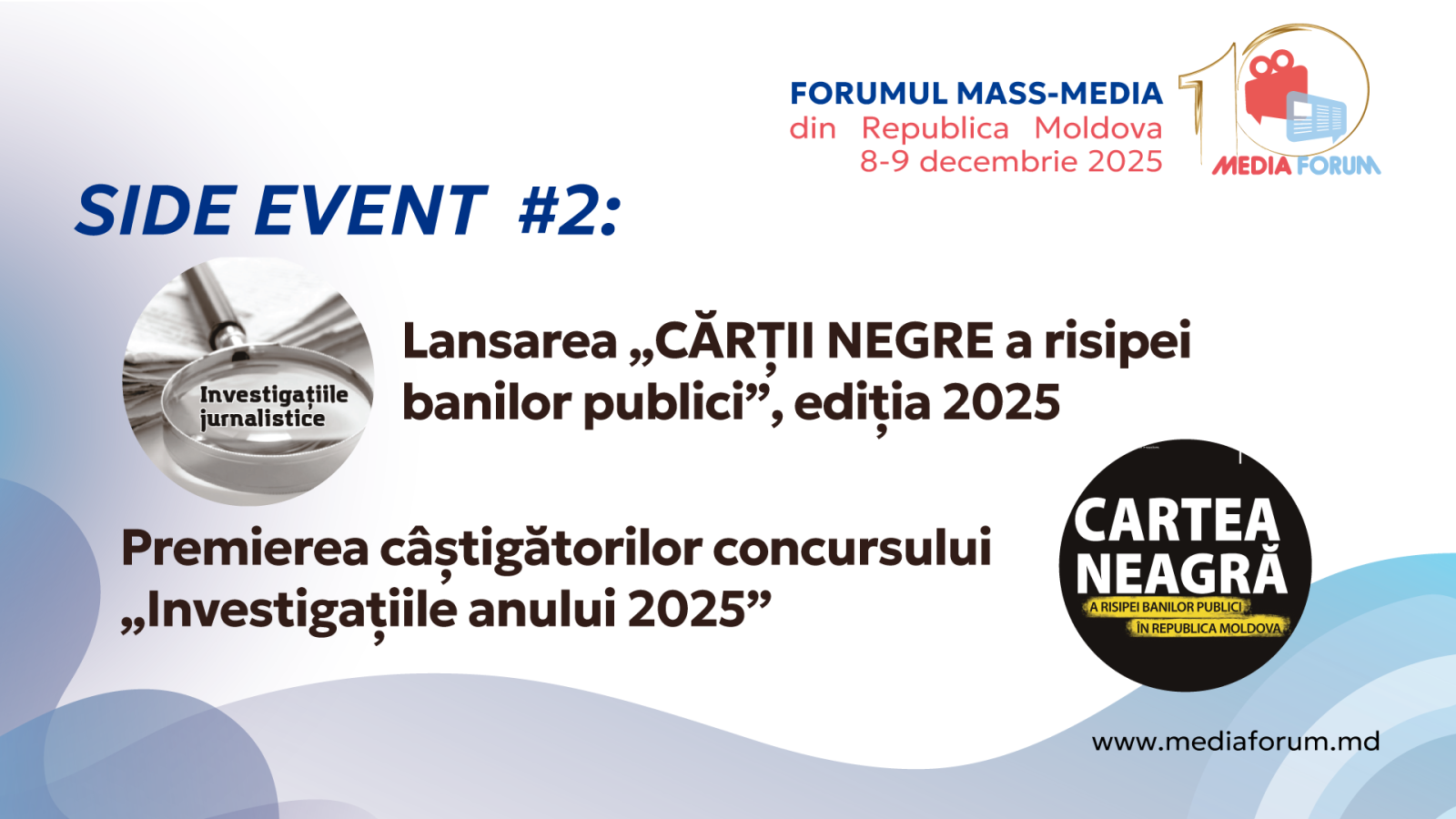 În cadrul Forumului Mass-Media 2025, care se va desfășura pe 8 și 9 decembrie la Chișinău, sunt planificate și două evenimente speciale: unul dedicat presei locale și altul - jurnalismului de investigație. Tradițional, va fi lansată o nouă ediție a „CĂRȚII NEGRE a risipei banilor publici în Republica Moldova” și vor fi premiate cele mai bune investigații jurnalistice ale anului.