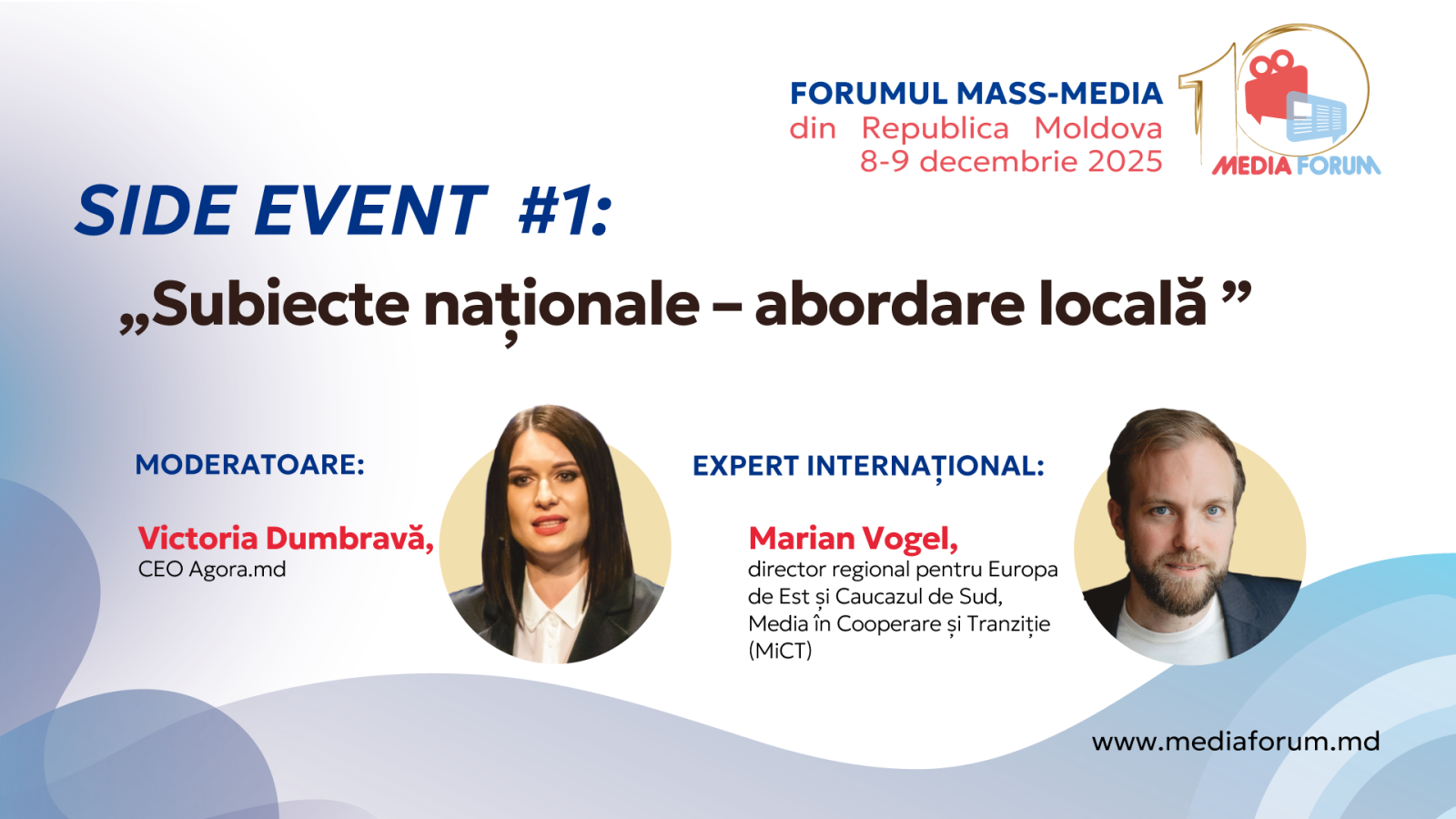 La evenimentul „Subiecte naționale – abordare locală”, găzduit de organizația Media în Cooperare și Tranziție (MiCT) cu sediul la Berlin, se va discuta despre cauzele declinului presei regionale/locale și insuficiența surselor de informație credibile în teritoriu, capabile să reflecte obiectiv și echilibrat problemele locale. Moderatoarea evenimentului, Victoria Dumbravă, directoarea portalului Agora.md, va aborda și eventualele soluții pentru această problemă, cum ar fi mobilizarea comună a profesioniștilor media, a altor creatori de conținut, autorităților publice și partenerilor de dezvoltare pentru a susține consolidarea mass-mediei locale credibile, foarte importante pentru comunități și pentru protejarea spațiului informațional de dezinformare. În calitate de expert internațional va participa Marian Vogel, director regional MiCT pentru Europa de Est și Caucazul de Sud. Marian are o vastă experiență în date și comunicare, a implementat campanii electorale bazate pe date la nivel local și național în Germania, Italia și Austria. În prezent, coordonează programe de sprijin de urgență pentru jurnaliști și instituții media, susținând astfel ecosistemele media în condiții dificile și cu risc sporit.