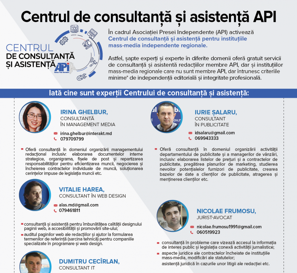 1. Oferirea asistenței specializate la cel puțin 15 redacții ale instituțiilor media independente din regiuni timp de 11 luni, asigurând continuitatea Centrului de consultanță și asistență cu șapte experți din diferite domenii;