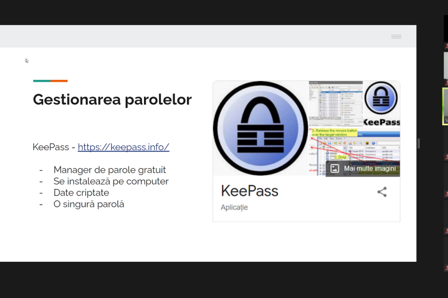 Pentru a sustrage ilegal informații din mediul virtual, spărgătorii (crackeri) de programe informatice instalează programe speciale în calculatoare, profitând de neatenția sau iresponsabilitatea unor utilizatori. Ulterior ei îi șantajează în scopuri financiare sau vând informația altor persoane, companii etc. „Regula de baza este să nu accesăm link-uri, documente necunoscute, să nu descărcăm programe neverificate din Internet, să nu răspundem la mesaje trimise pe mail de pe adrese necunoscute, chiar dacă expeditorii promit că vă lasă moștenire milioane de dolari etc. Fiecare cont de Google, Facebook, Instagram sau altele trebuie să aibă parole distincte, separate, iar autentificarea să fie neapărat prin doi pași. Pentru crearea parolelor, utilizați litere majuscule și minuscule, cifre, semne speciale, spre exemplu o frază în rusă scrisă în grafie latină, dar neapărat să aibă cel puțin 12 caractere. O parolă sigură arată cam așa: eX3Mp!ud#P@r0l2”, iar cel mai securizat cont trebuie sa fie poșta electronică, deoarece prin ea cel mai ușor se restabilesc celelalte conturi”, a spus Vitalie Harea, unul din traineri. El le-a recomandat managerilor media să aibă grijă ca în redacție să existe cel mult două persoane care administrează conturile redacțiilor, acestea să fie persoane de încredere care să delege, la rândul lor, roluri de actualizare a platformelor. Pentru gestionarea parolelor pot fi utilizate unele programe gratuite sau cu plată, cum ar fi KeePass - https://keepass.info/ sau LastPass - https://www.lastpass.com/, iar pentru a verifica dacă poșta electronică nu a fost spartă –https://haveibeenpwned.com.